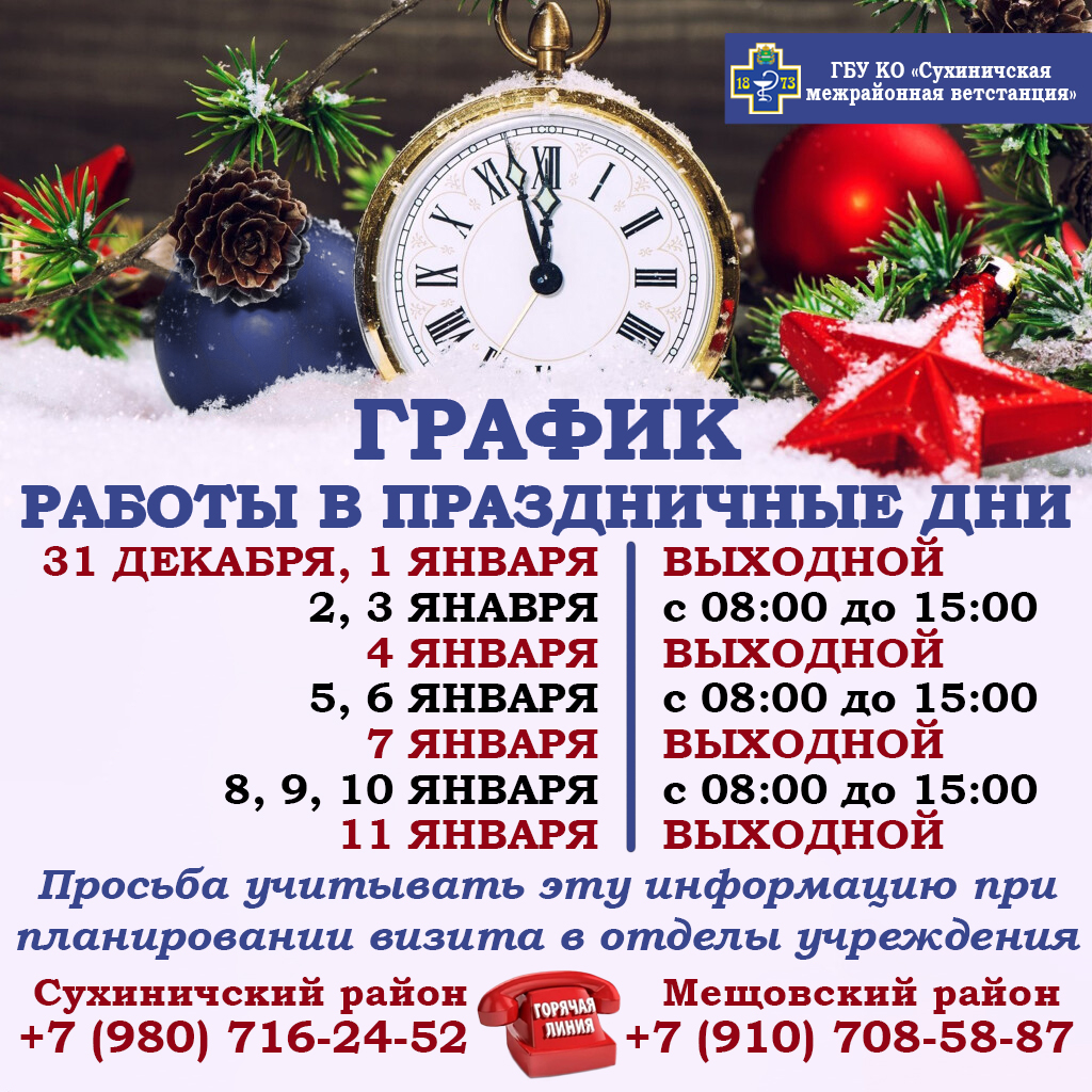 График работы ГБУ КО "Сухиничская межрайонная ветстанция" в праздничные дни Новости График работы ГБУ КО "Сухиничская межрайонная ветстанция" в праздничные дни 30.12.2025